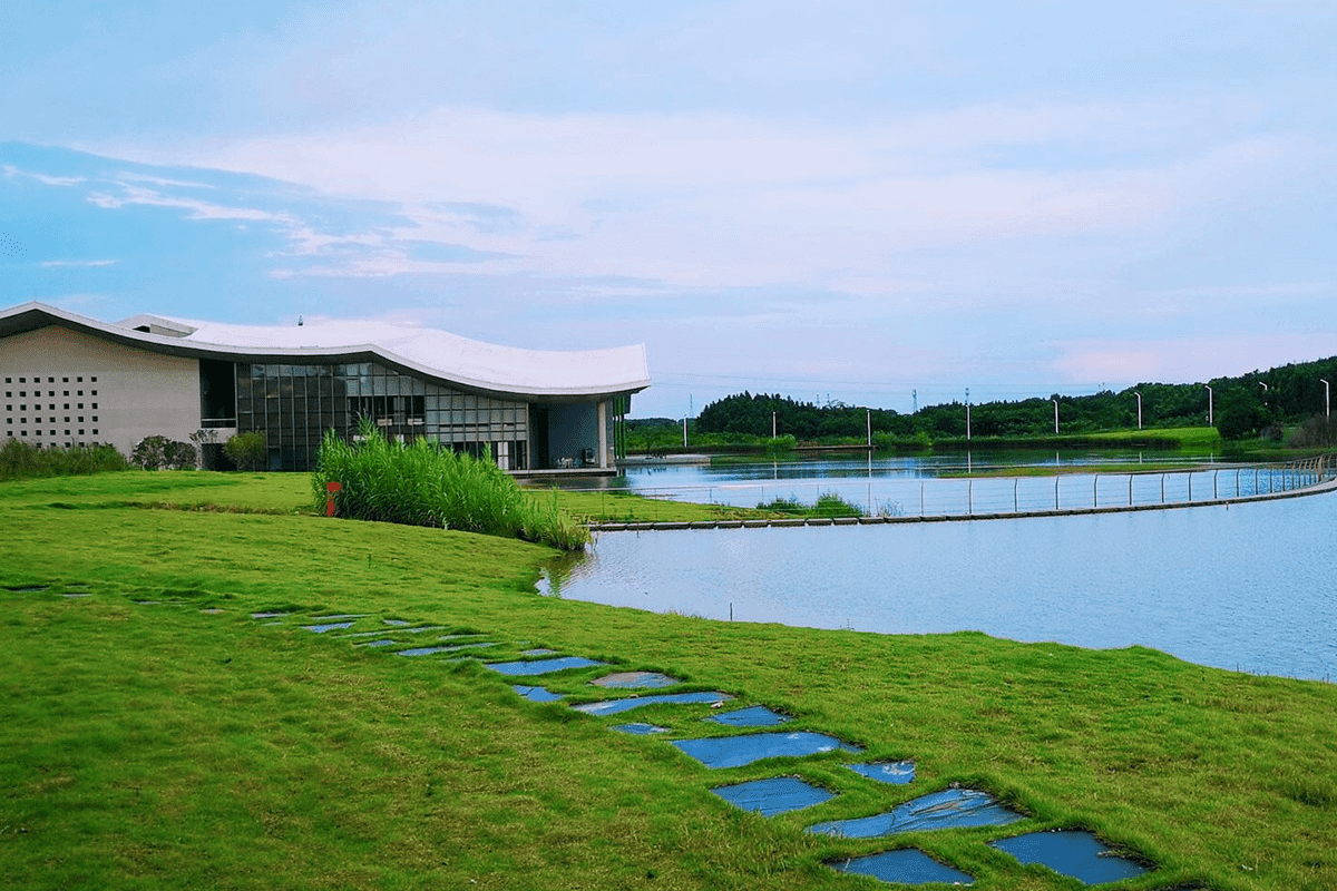 武汉仙鹤湖墓园园区金菊园采用西式卧碑设计,呈现出“见花不见墓、见景不见碑”的独特风格。园区开阔平坦,绿草与鲜花交相辉映,水面与地面融为一体,在蓝天白云的映衬下,展现出一幅如梦似幻的“花海”景象。